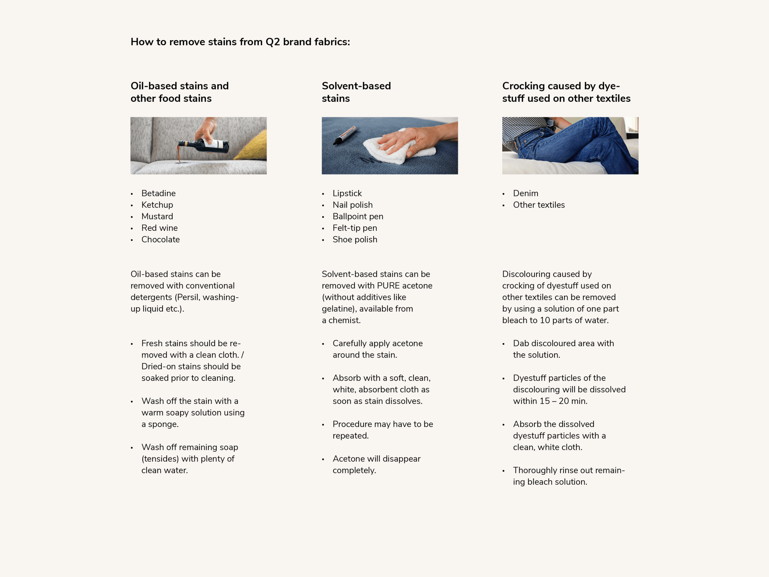 Like all materials in daily use, upholstery fabrics also require regular care. Stains should not be allowed to become too intense so as not to make cleaning more difficult and to maximize the life of the fabric. Always follow the manufacturer’s cleaning and care instructions. Lighter covers should be cleaned more frequently, as staining is more visible. This should be taken into account at the time of purchase. Visible discoloration due to foreign dyes, e.g. from jeans, can also occur with light-coloured upholstery. Friction causes dye to be released, which is deposited on the upholstery fabric. In this case, it is a defect in the quality of the clothing fabric and not the upholstery fabric. CHECK THE COLOR FASTNESS: Select a concealed spot on your furniture for testing. Remove any dust, if present. Soak a white, soft cotton cloth with cleaning agent (the cloth should always be clean) and rub it over the upholstery fabric. Only after drying can you judge whether the upholstery fabric is colorfast. With Q2 and Charmelle fabrics from Rohleder, almost all common household stains can be removed with a solution of warm water and mild detergent. Stains that are not water-soluble can also be removed with a solvent such as acetone. Discoloration can also be removed with the help of diluted bleach. You can find detailed instructions on our homepage.