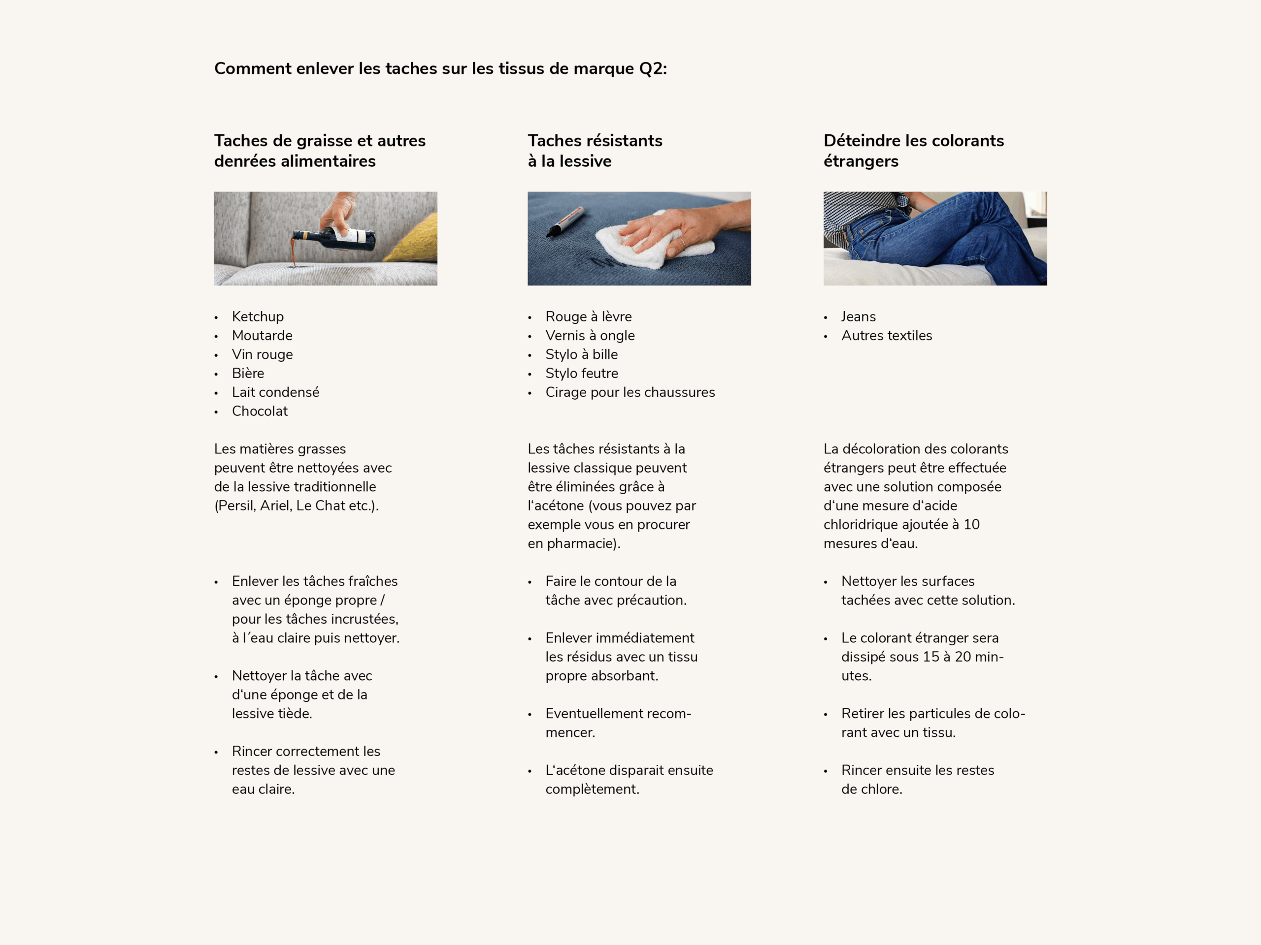 Notre label de qualité Q2 est une garantie de qualité supérieure pour les acheteurs du monde entier. Les textiles en cuir brut présentent d’excellentes propriétés d’entretien et de nettoyage – et ce, sans aucun additif chimique. En principe, toutes les taches (à l’exception des instruments d’écriture résistants aux solvants) peuvent être facilement éliminées des tissus Q2. Essayez d’éliminer les taches immédiatement après leur apparition. Pour cela, utilisez un chiffon absorbant et tamponnez la tache.